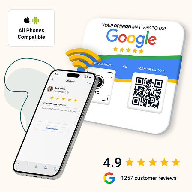 Reviews have a major impact on the growth of your business. To help you grow, our Reviewly Plates, Stickers, and Smart cards help your happy customers quickly and easily leave you 5 star reviews on Google today!